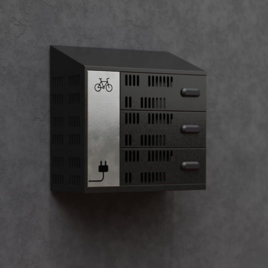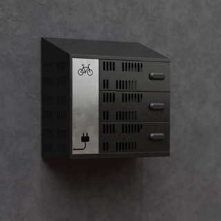 Opladningsskab designet til sikker opbevaring og opladning af 3 stk. cykelbatterier.