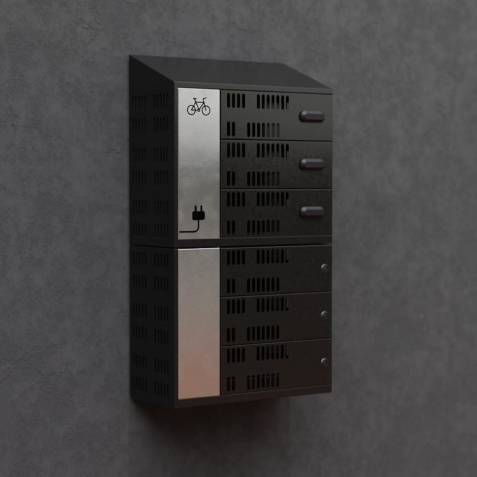 Opladningsskab designet til sikker opbevaring og opladning af 6 stk. cykelbatterier.