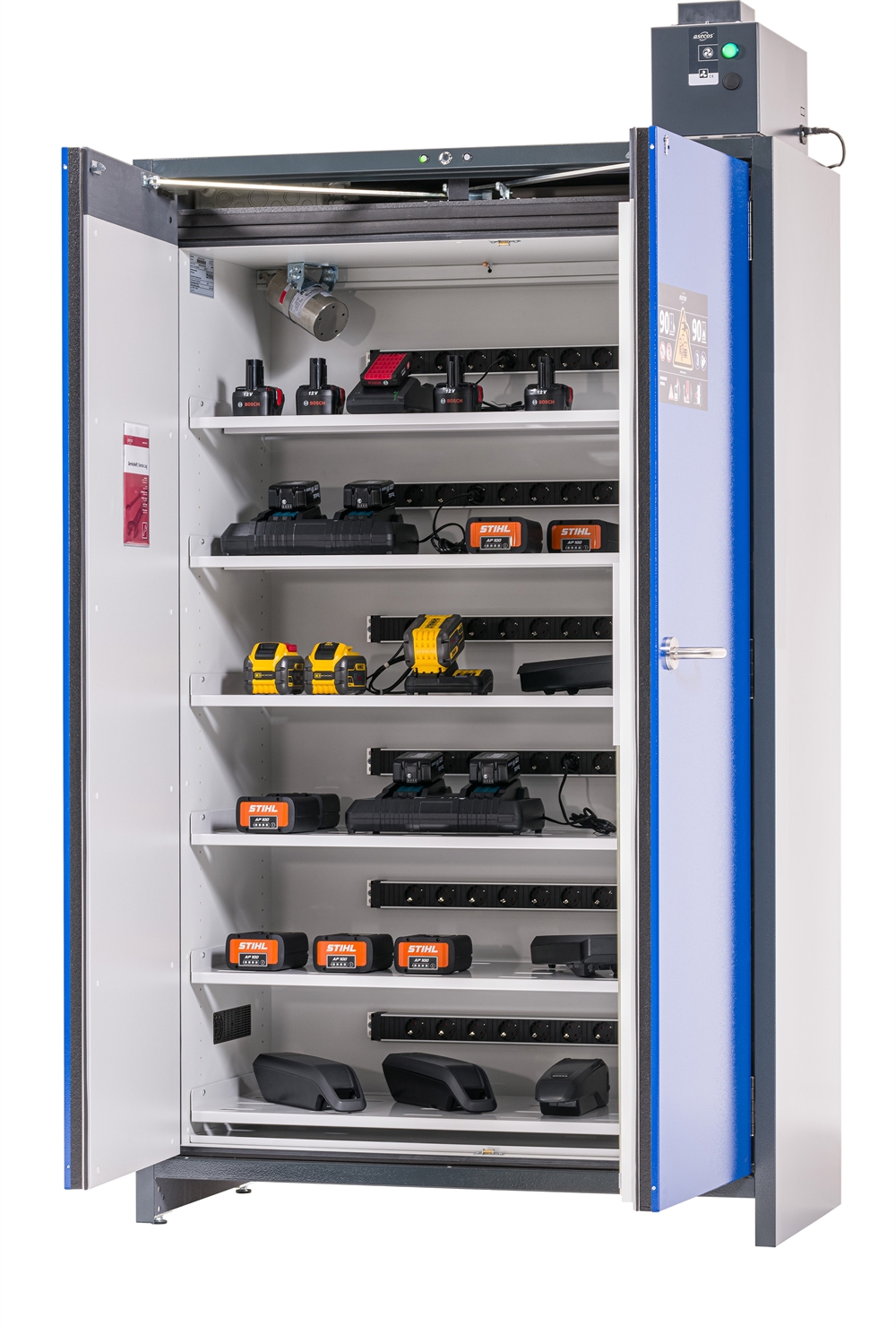 Teknisk ventilation for at holde temperaturen i skabet nede under opladning.